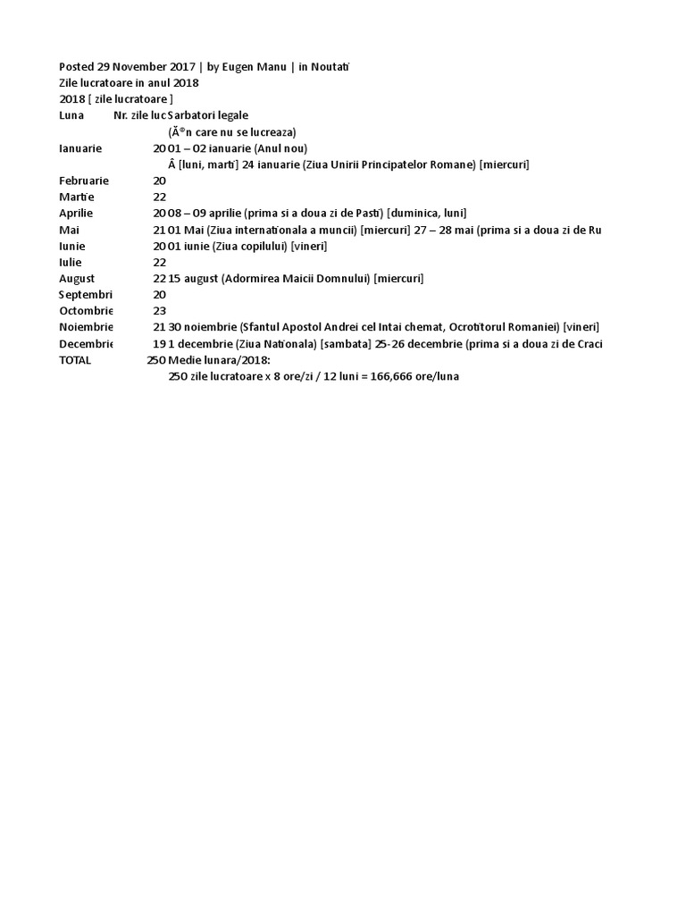 Numărul de zile lucrătoare din fiecare lună a anului 2018. 20 zil e, respectiv 160 numarul de zile lucratoare a fost calculat utilizand formula: 2018 zile lucratoare luna nr.